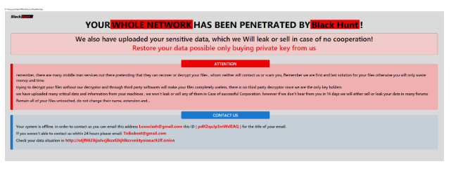 | sha256 | 32877793a1e0d72235e9e785e1f55592c32c9f08b73729815b8103b09a54065f | Black Hunt ransomware |