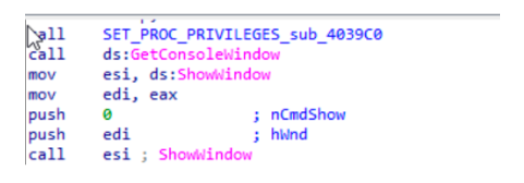 After modifying process privileges, the malware hides its window by invoking the `ShowWindow` function with the `nCmdShow` parameter set to 0, which corresponds to `SW_HIDE`. This action ensures that the malware's window is not visible to the user, allowing it to operate stealthily in the background without drawing attention.