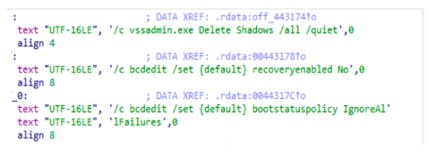 Afterwards , the malware removes the shadow copies using vssadmin.exe Delete Shadows /all /quiet and disables automatic repair by executing bcdedit /set {default} recoveryenabled No.