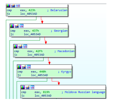 The malware uses the `GetSystemDefaultUILanguage` function to identify one of 15 hardcoded languages. If it detects any of these languages, it terminates execution.