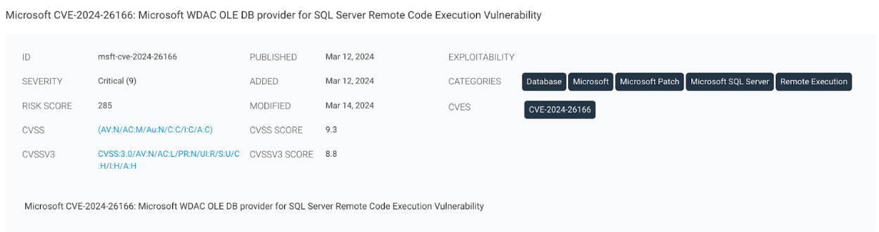 Below is an example of a latest vulnerability for Microsoft CVE-2024-26166 with the CVSS and Active Risk scores unaffected by NVD: