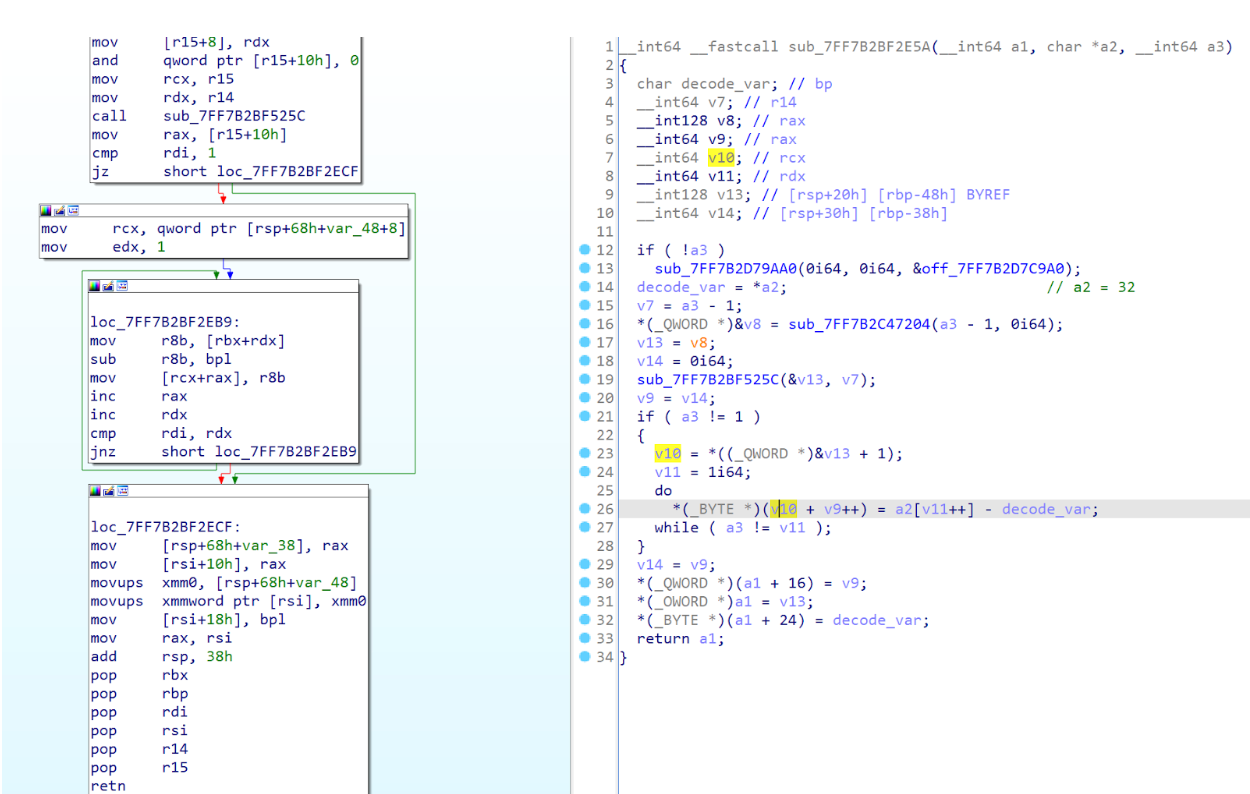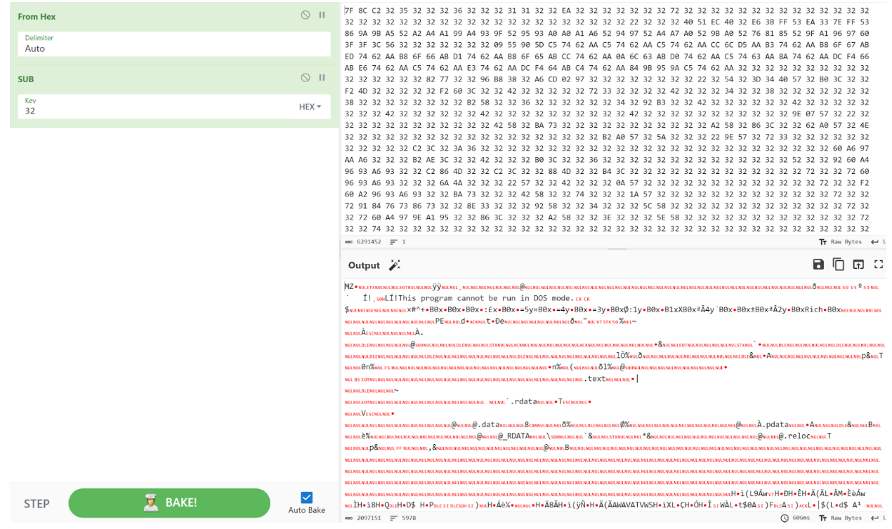 Upon initial analysis, the downloaded data appeared to be encoded. Subsequently, the data is passed into a function tasked with decoding it. The decoding process involves reading each byte and subtracting the hexadecimal value 32.