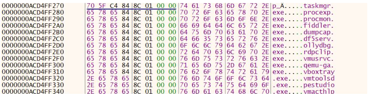 The program will then perform anti-analysis techniques, specifically querying for the username and open process and comparing them to a list of known sandbox usernames and tools. The list of usernames and processes are also XOR-encrypted and are decrypted at runtime. Based on Open Source Intelligence, we determined that another malware known as Serpent Stealer contained a similar table of user names. See Appendix A below for the complete list.