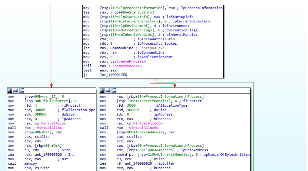 Using our static config extractor, we extracted the final payload, a 64-bit executable. During initial analysis of the final payload, we observed that the program utilized the API functions VirtualAlloc and VirtualProtect. During execution of the program, it utilized VirtualAlloc to read in and store additional code, including encrypted data, into a new region of memory. The program then called upon the function VirtualProtect, changing the newly allocated region of memory (containing the new code) to be executable. We also observed the 64 bit executable (obtained from the IDAT Loader python script) had the capability to perform process hollowing by starting a new process, notepad.exe, and injecting the code into the newly created process.