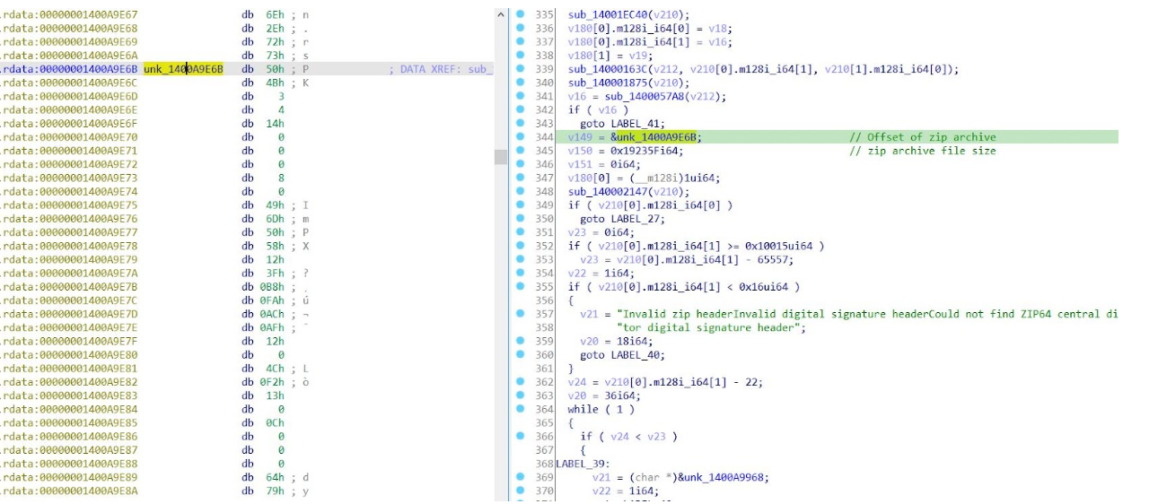 After analysis of the decoded binary, we determined that it was another executable written in Rust. The program's executable contains a zip archive within the .rdata section. During execution, the program generates a folder with a randomly generated name in the %TEMP% directory and extracts the contents of the archive into this newly created folder.