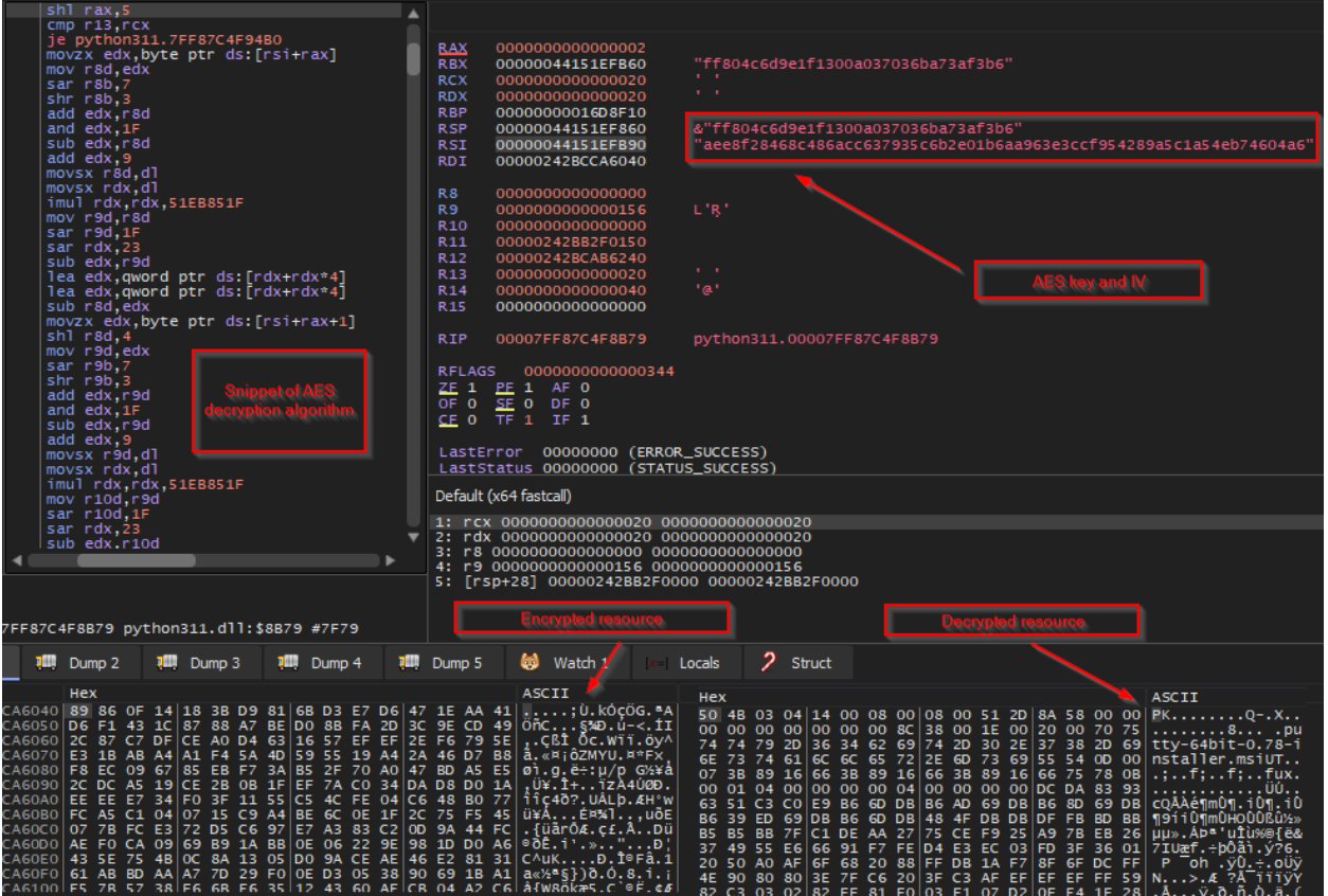 The primary payload contained within python311.dll is a compressed archive encrypted and included within the DLL's resource section. During execution, this archive is unpacked to execute two child processes.