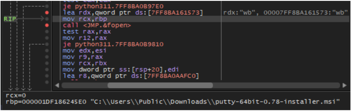 To execute the PuTTY installer, the malware first creates a copy of the MSI file in the hard-coded directory C:\Users\Public\Downloads\ via a call to fopen and then decompresses and writes the retrieved MSI package content with multiple successive calls to fwrite and other CRT library file io functions, followed by fclose. The full output path is assembled by concatenating the target directory with the desired file name, which is retrieved from original_installer.txt. The contents of original_installer.txt are identical to the name of the MSI package observed in the resource, for this sample: putty-64bit-0.78-installer.msi.