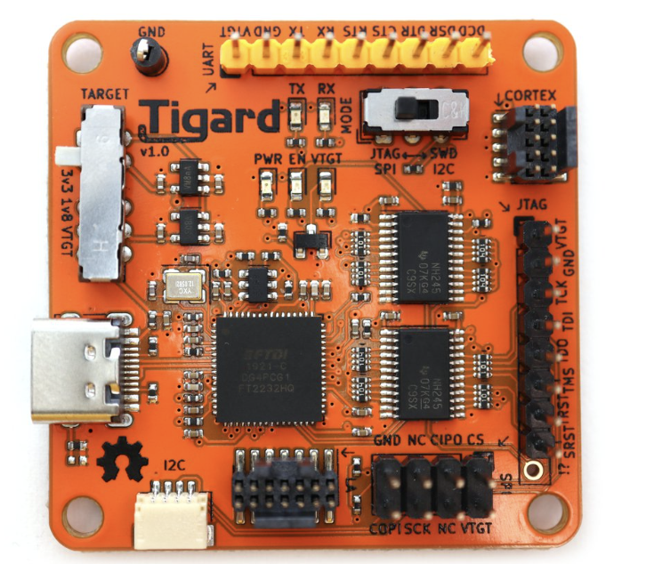 The Tigard is a great open-source tool that has support for all the commonly used interfaces you might encounter on modern day embedded devices. It has support for Universal Asynchronous Receiver-Transmitter (UART), Joint Test Access Group (JTAG), Serial Peripheral Interface (SPI), Inter-Integrated Circuit (I2C), and Serial Wire Debug (SWD) connections. This device allows you to connect to various serial consoles or even extract the contents of commonly found flash memory chips. It is powered by a USB-C connection and also has the ability to select commonly used voltage supplies to power components when needed.