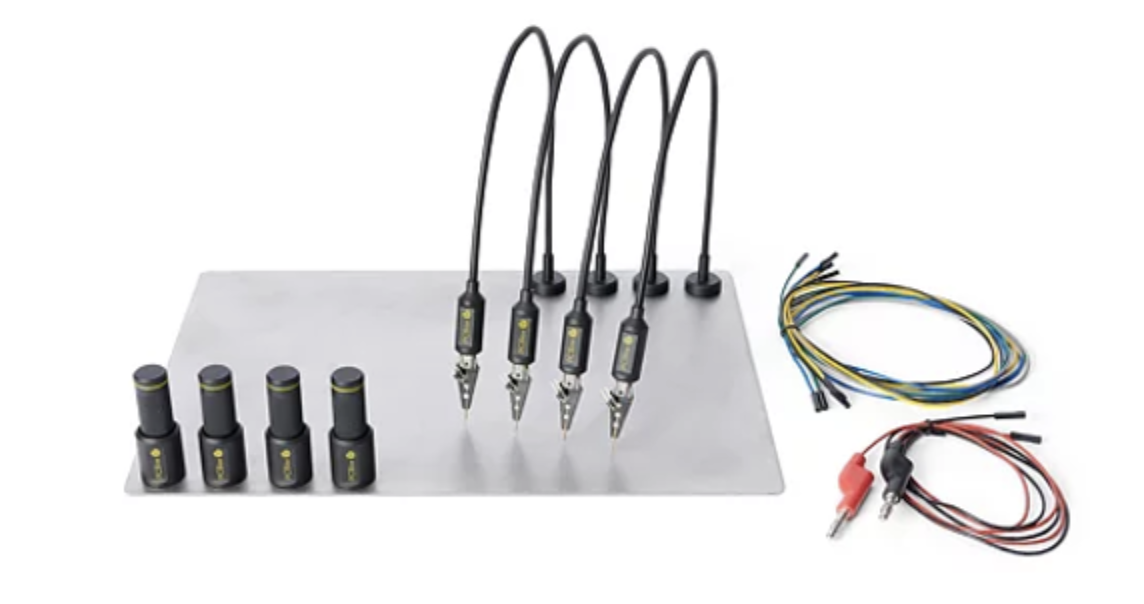 The starter level probe set includes 4 hands-free probes, a set of PCB holders, a magnetic base, and accessories. Oftentimes embedded devices contain small components on the circuit board that are not easily accessible due to size requirements. These probes allow for quick, solder-free, connections to be made to embedded devices. All you need to do is position the spring-loaded probes on areas of the circuit board and connect the included dupont wires to either a logic analyzer or a serial debugger to interface with the target device. The included circuit board holders are a nice touch to ensure the circuit board is kept firmly in position while working.