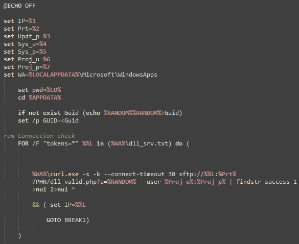 The batch file dllBus.bat contains functionality to facilitate the theft of information from Google Chrome, Mozilla Firefox, and multiple cryptocurrency wallets. The copy of curl.exe dropped by the installer is also used to connect to a list of command-and-control (C2) addresses hosting SFTP servers. The curl commands are used to download an updated list of C2 addresses, stored as plaintext within the file dll_srv.txt, and to download and execute additional payloads saved within encrypted ZIP archives named Updt.zip, Apps.zip, and BB.zip. The batch script will also attempt to compress all files on the infected system that have specific file extensions and exist in directories that are not on a hardcoded blacklist (for exfiltration). All stolen data is ultimately compressed using 7z.exe and uploaded directly to the selected C2 SFTP server using curl.