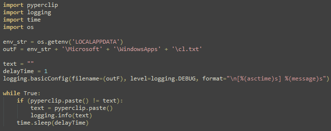 The payloads dllTemp32.exe and dllCache32.exe stored within Apps.zip contain a clipboard stealer and a keylogger, where the results are saved to the files cl.txt and kl.txt, respectively, within the staging directory at %LOCALAPPDATA%\Microsoft\WindowsApps\.