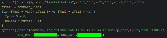 When dllBus32.exe is executed, it also serves as a small wrapper for calling CreateProcessA, though it initially retrieves several important command line parameters. First, a call to the CRT library function sprintf concatenates a hard-coded IPv4 address. Then, a second call to sprintf concatenates the assembled IPv4 address with several other arguments to be passed to the batch file dllBus.bat. Finally, CreateProcessA is called with the fully assembled command line.