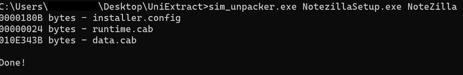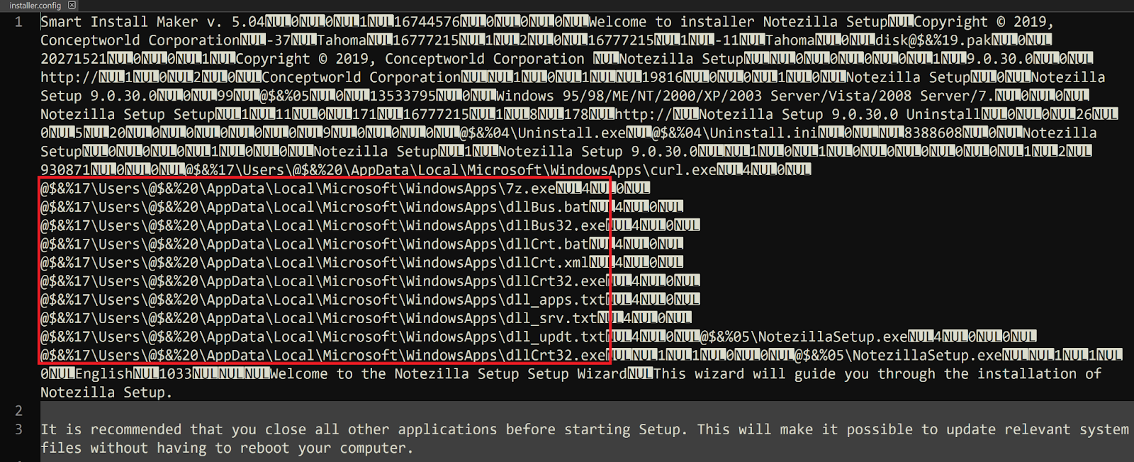 Using the sim_unpacker plugin for the tool UniExtract2, we were able to unpack and acquire most of the contents of the installation package, such as the embedded files and configuration information. The configuration file contains references to the legitimate software installer for Notezilla, which is dropped into %TEMP% during execution, and multiple files that are dropped into the installation directory (i.e., staging folder) %LOCALAPPDATA%\Microsoft\WindowsApps\ during execution.