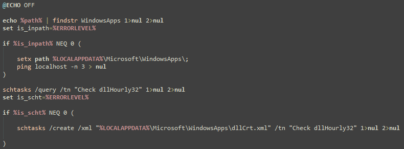 The batch file dllCrt.bat will then create a hidden scheduled task named Check dllHourly32 using schtasks.exe and an XML file that was previously dropped into the staging directory at %LOCALAPPDATA%\Microsoft\WindowsApps\dllCrt.xml. The scheduled task Check dllHourly32 will then execute the file %LOCALAPPDATA%\Microsoft\WindowsApps\dllBus32.exe every three hours after being initially created, which means that the primary malware payload will not be executed until at least three hours after the user originally executed the trojanized installer.