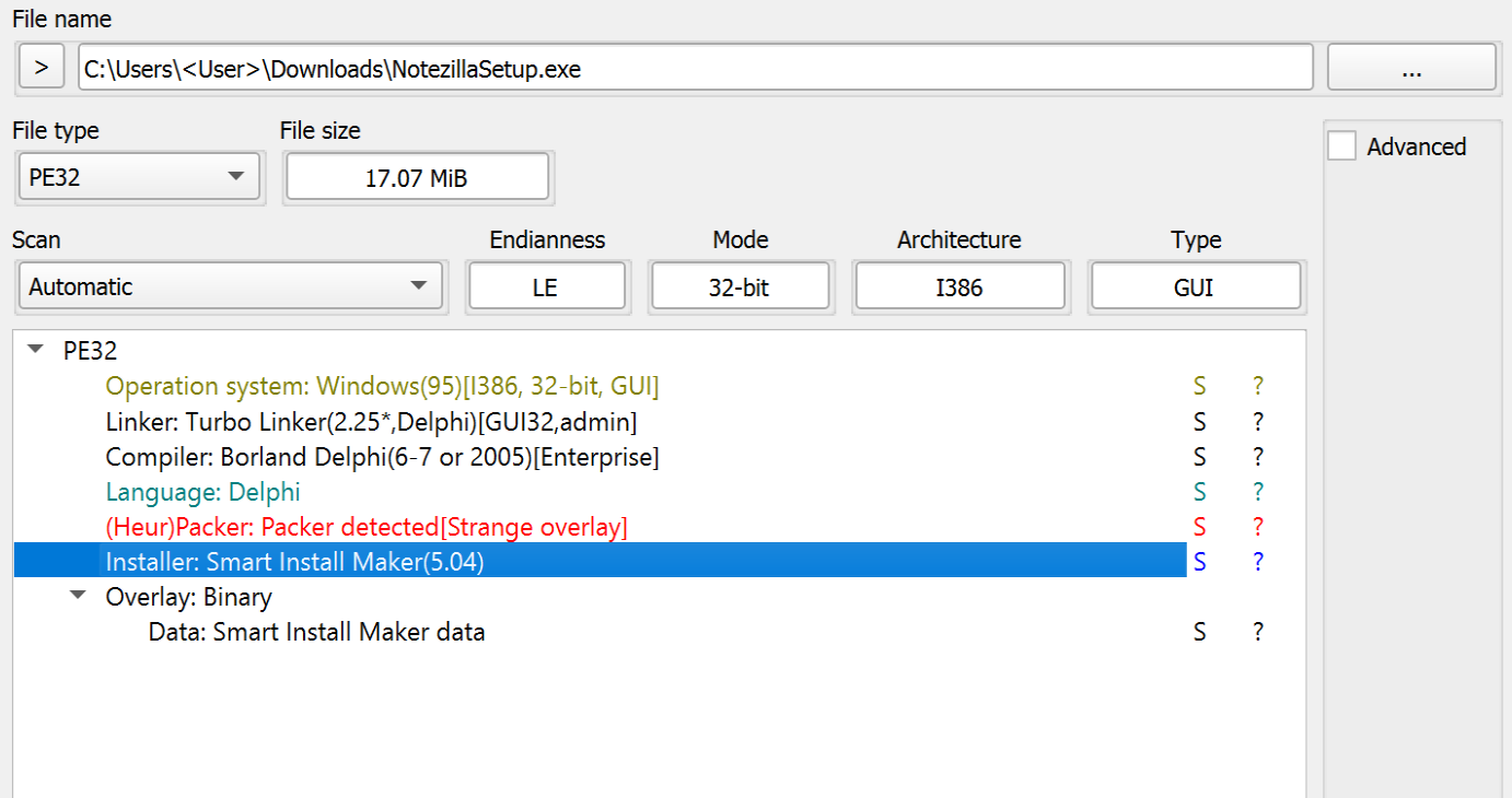 The installer served by conceptworld[.]com for Notezilla at the time of investigation was NotezillaSetup.exe, which, based on static analysis, is packed using software called Smart Install Maker(5.04).