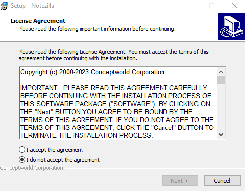 | NotezillaSetup.exe | 51243990ef8b82865492f0156ebbb23397173647c02a0d83cf3e3dfb4ef8a6bc | 15.19 MB | Legitimate, signed by Conceptworld. |