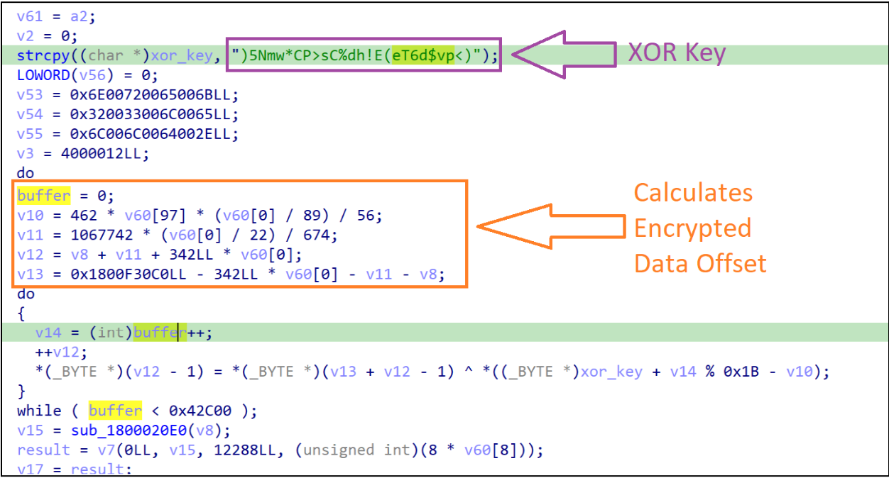 While analyzing the export function remi we observed that the function starts by storing a hardcoded string )5Nmw*CP>sC%dh!E(eT6d$vp<), which is reserved for later use. The function then calculates the resource located at offset (0x00EB2C0) that marks the start of the encrypted data, which will be decrypted using an XOR decryption routine with the previously stored string.