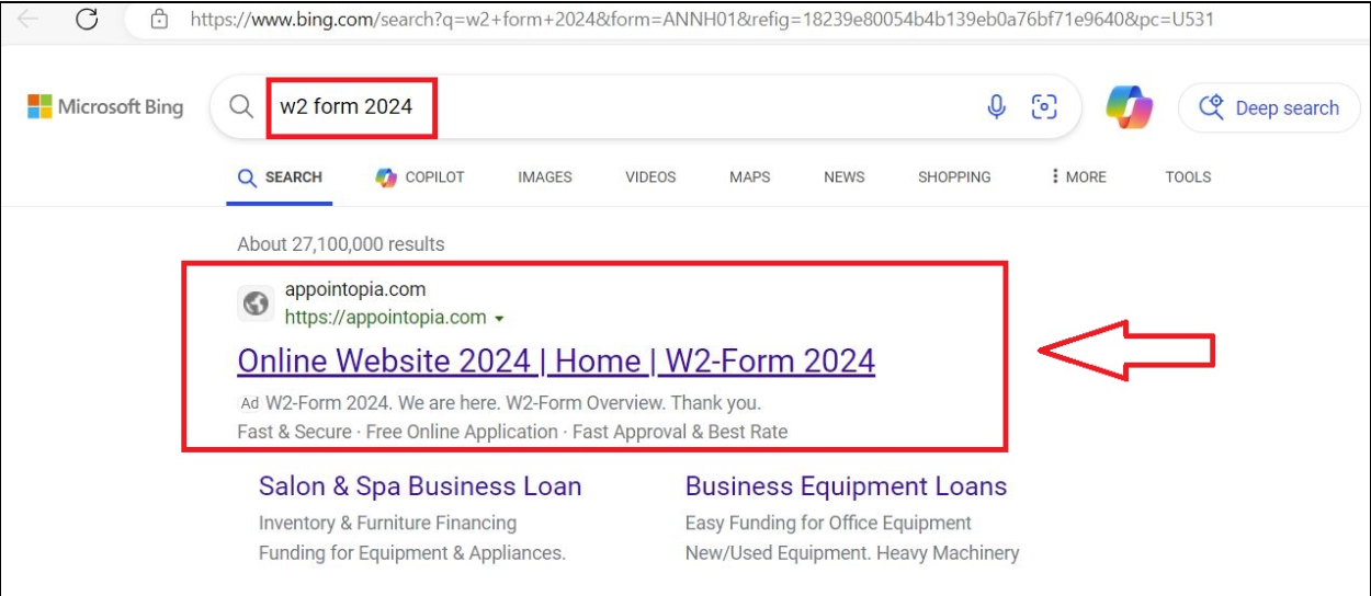 After replicating the incident in a controlled environment, we observed that following the query for w2 form 2024 using Bing, the top result is a link to the domain appointopia[.]com which claims to have W2 forms available for download.