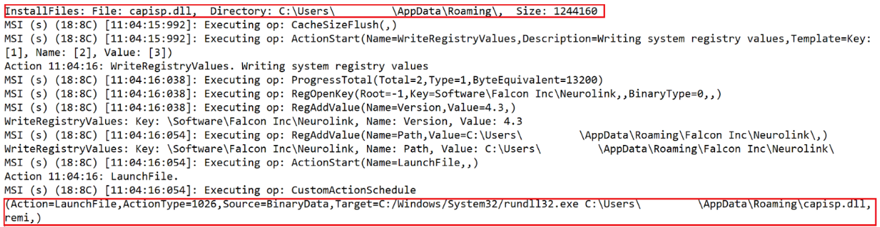 We also observed that the MSI package neuro.msi contained a custom action whose function was to drop the DLL, capisp.dll, within AppData/Roaming/ folder and execute it using rundll32.exe with the export remi.