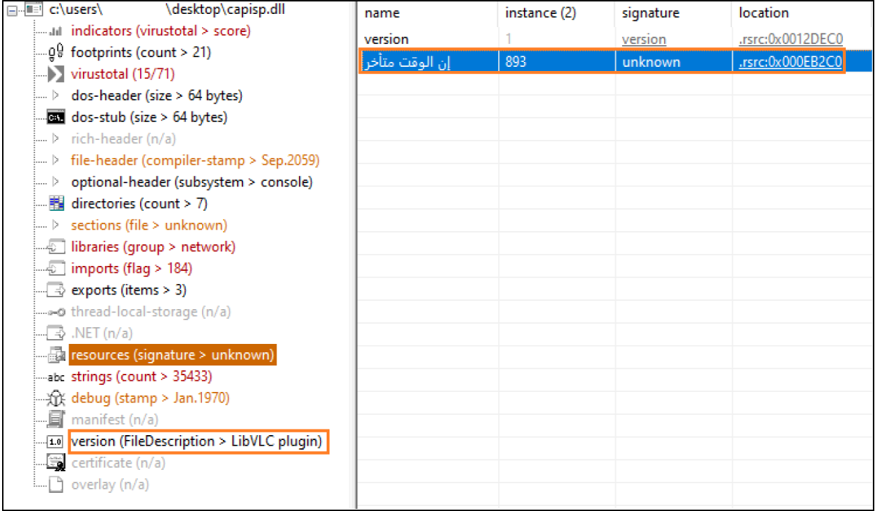 During initial analysis, we observed the DLL was associated with the VLC media player. We also observed that the DLL contained a suspicious resource named نالوقتمتأخر located at the offset of 0x00EB2C0. We determined that the resource name نالوقتمتأخر was Arabic and translates to ‘It is late’, referring to time.