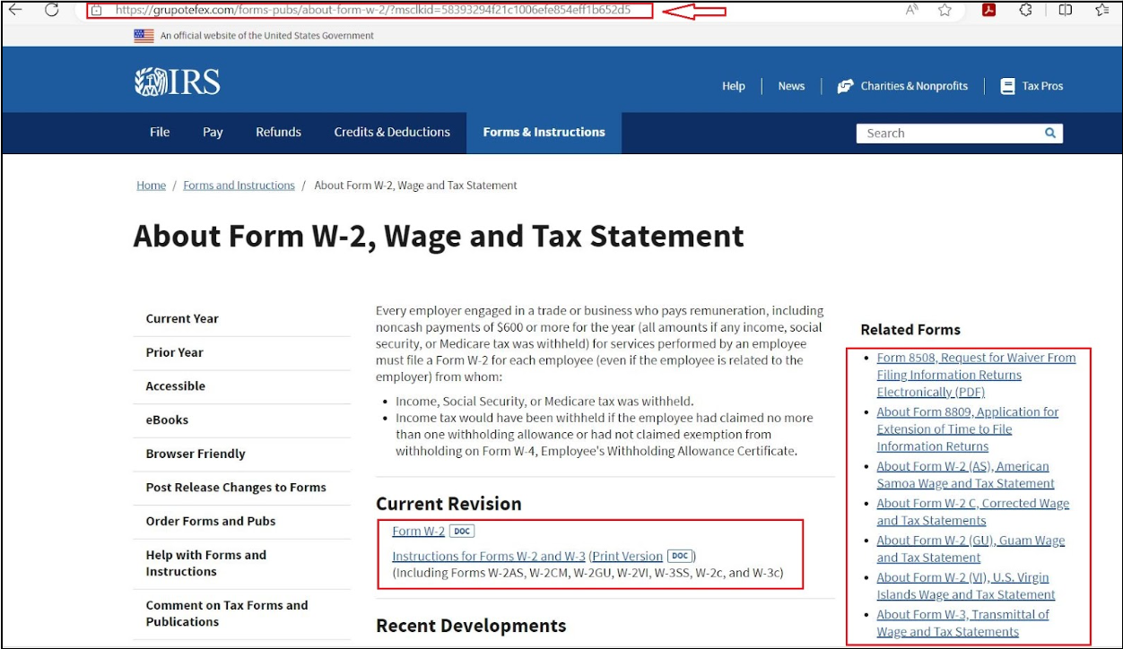 After clicking the link, the browser is directed to the URL hxxps://grupotefex[.]com/forms-pubs/about-form-w-2/, which presents users with a fake IRS site, luring users into downloading their W2 form.