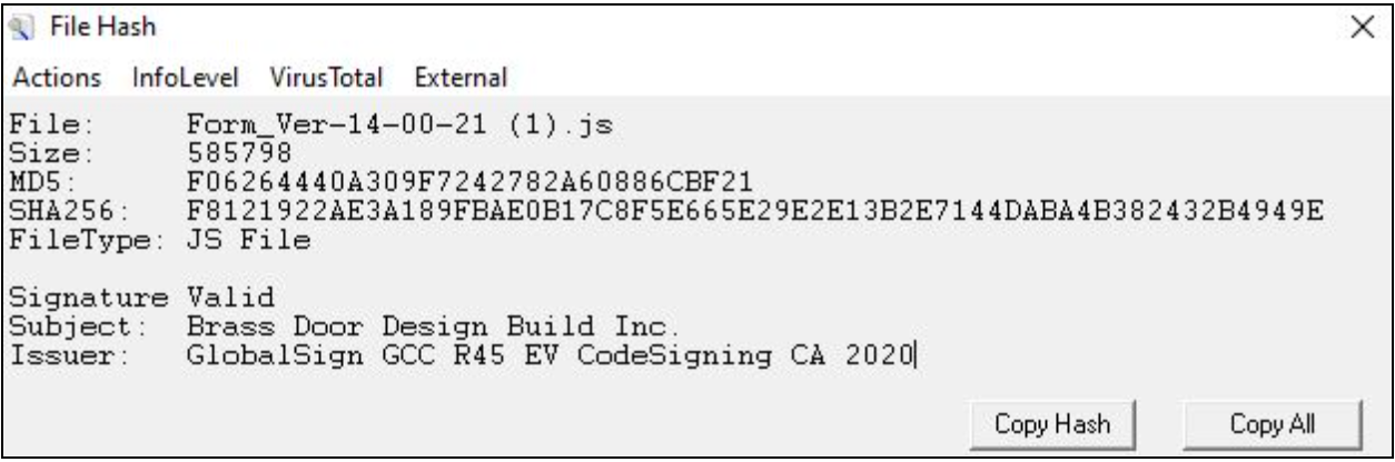 In addition, we observed that the JavaScript contained a valid Authenticode certificate issued to Brass Door Design Build Inc. Threat actors will embed valid certificates in order to exploit trust mechanisms and make the scripts appear legitimate.