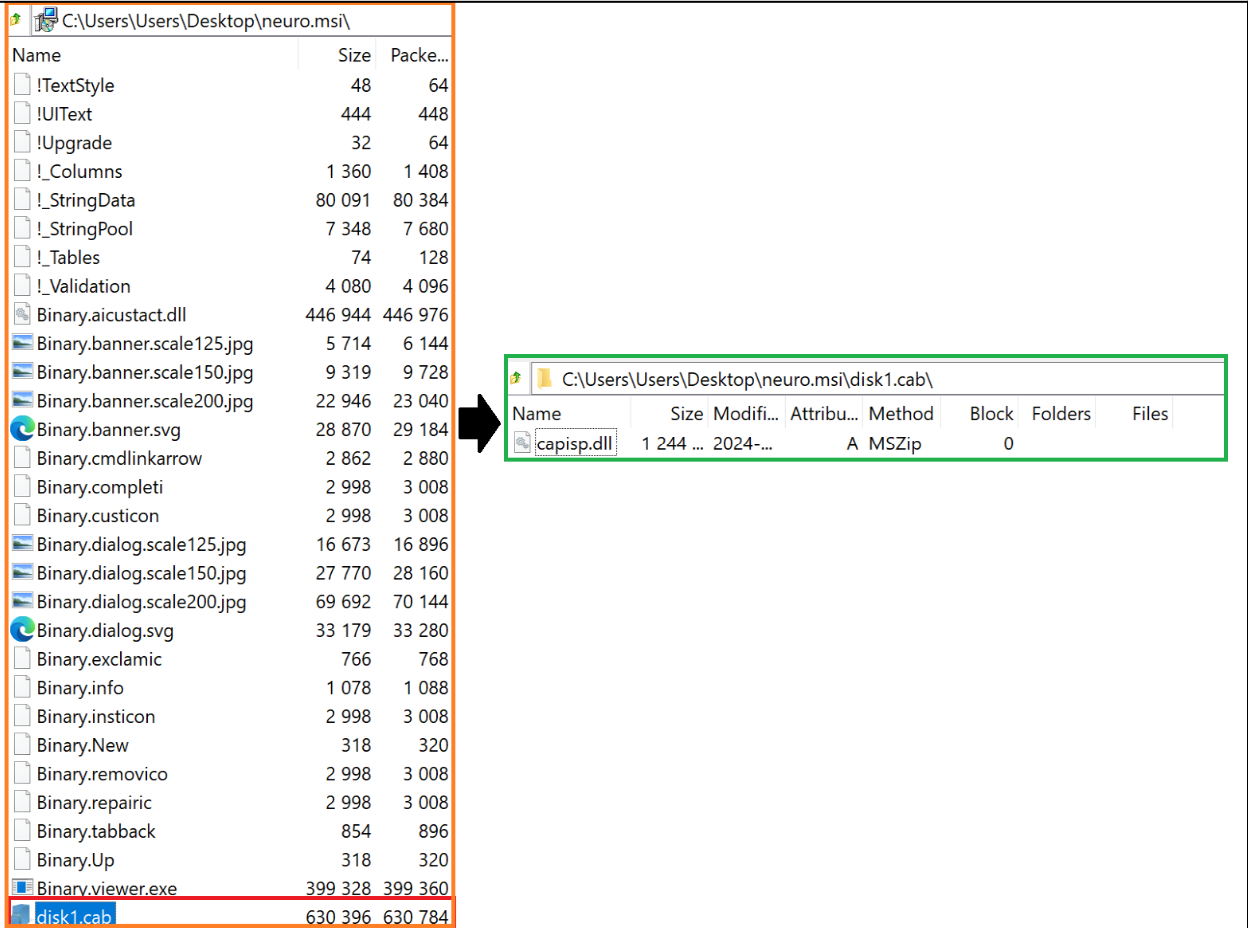 We acquired the latest MSI file, neuro.msi, from hxxp://85.208.108[.]30/neuro.msi and analyzed the contents. We observed that the contents of the MSI file contained a Cabinet (.cab) file named disk1.cab which stored a DLL, capisp.dll.