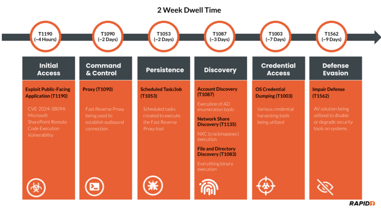 Rapid7’s Incident Response team recently investigated a Microsoft Exchange service account with domain administrator privileges. Our investigation uncovered an attacker who accessed a server without authorization and moved laterally across the network, compromising the entire domain. The attacker remained undetected for two weeks. Rapid7 determined the initial access vector to be the exploitation of a vulnerability, CVE 2024-38094, within the on-premise SharePoint server.