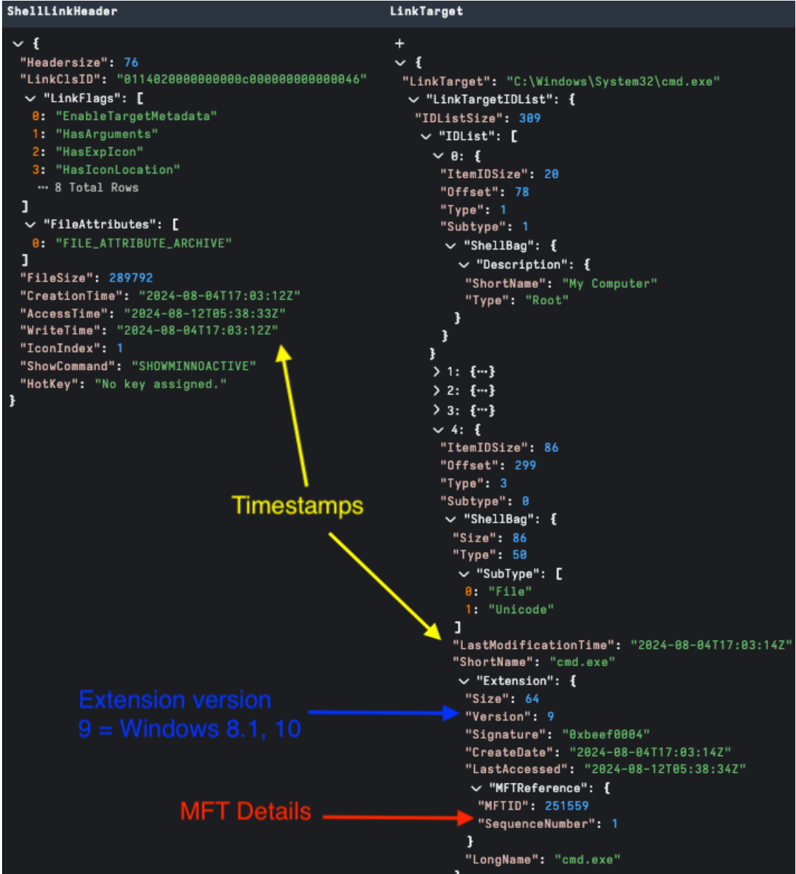 LINKTARGET_IDLIST is an optional structure enabled by the HasLinkTargetIDList flag, and provides an itemized path to the LNK target. The ItemIDList structure is shared across other Windows “Shell Items” with the ShellBags registry artifact probably the most well known.