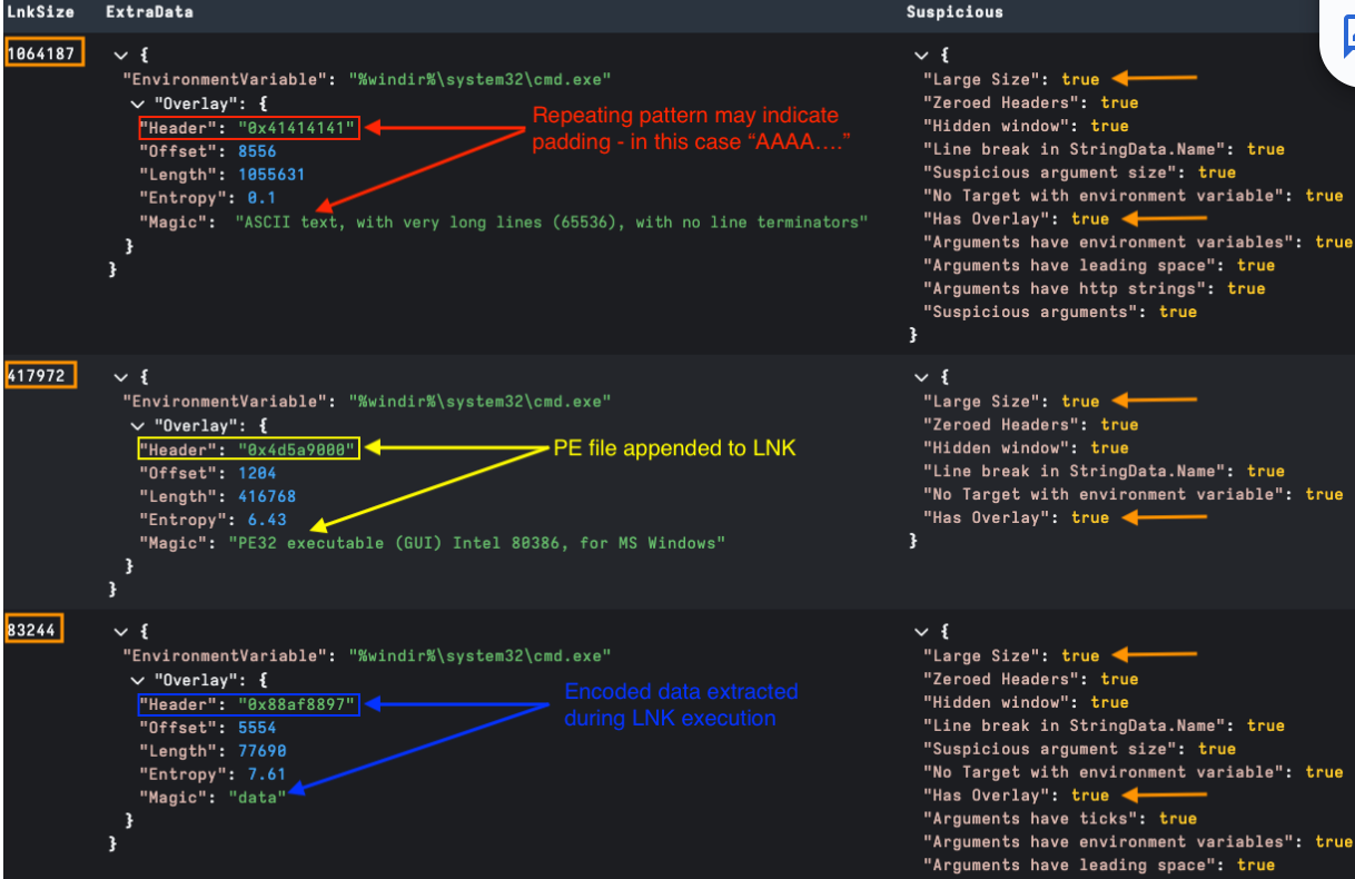 Some malicious LNKs also have embedded files. An example may be an embedded .exe, script, or even lure as part of a phishing campaign that is dropped and run as part of LNK execution. As normal LNK data isn't too large, a simple way to detect overlays is to check for any large LNK file sizes in bytes. We can also check for additional data beyond the end of the EXTRA_DATA structure.