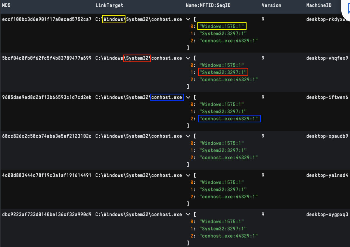 Clustering by Name and MFT ID can provide an interesting data point into the machine from which a LNK has been generated. Post-processing using Velociraptor, we can extract each shell item MFT ID and allow for comparison. This technique helps find potential LNKs generated by the same machine even if host metadata has been modified. Figure 5 below shows post-processing a collection of older publicly shared APT29 LNK files with matching MFT IDs and different machine metadata.
