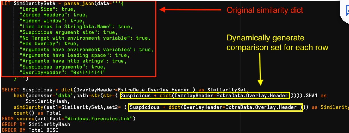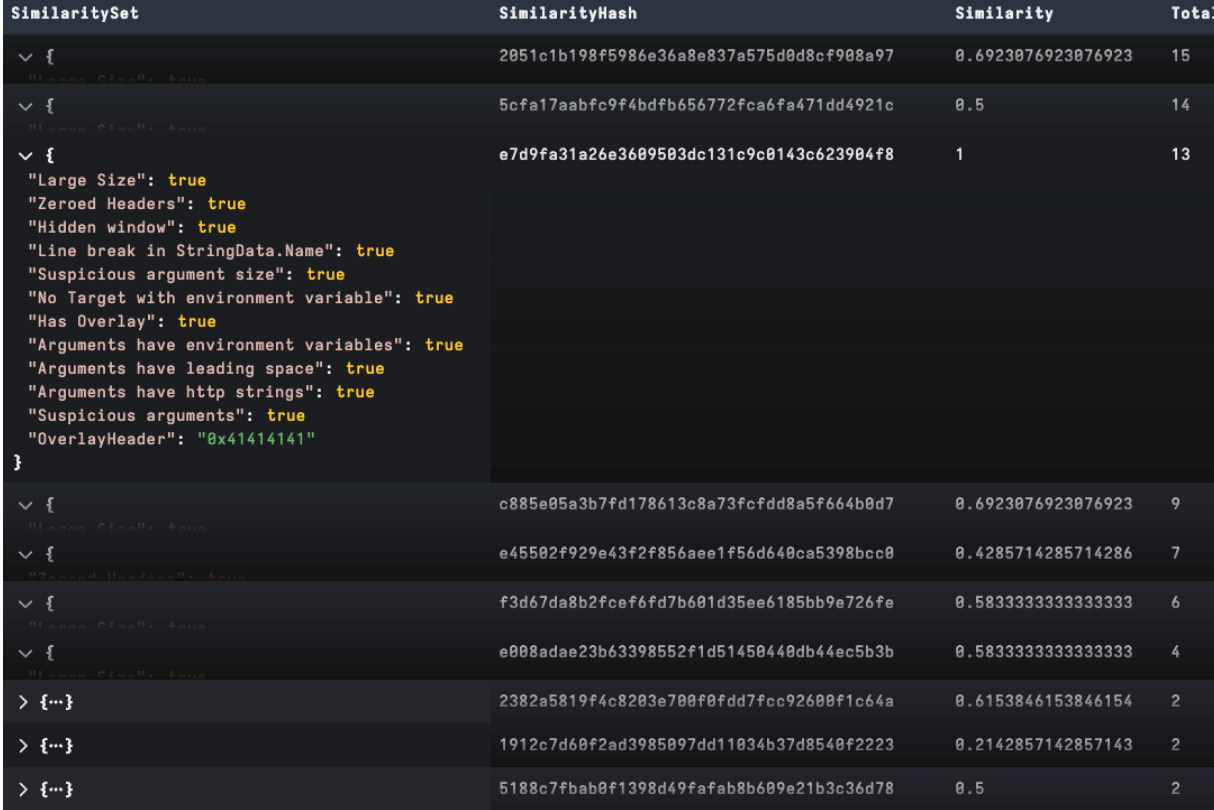 In the example below, we have generated several clear clusters from a loose YARA-based collection targeting a LNK builder tool. We started by parsing our target LNK, then created a dictionary using its suspicious field and added its unique OverlayHeader field, which relates to padding. We then compared for similarity to each collected file and grouped for frequency analysis. It is worthy to note, depending on the analysis goal we can easily create our own features to test using VQL to modify, add or remove items to our dictionary set: