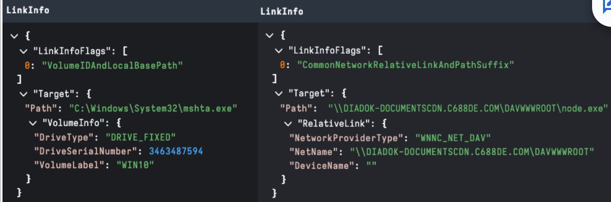 Enabled by the HasLinkInfo flag, this structure specifies information necessary to resolve the target if it is not found in its original location. A LNK target path is one of the first data points reviewed by analysts. For example, looking for suspicious LOLBins is an easy win when combined with LNK arguments.