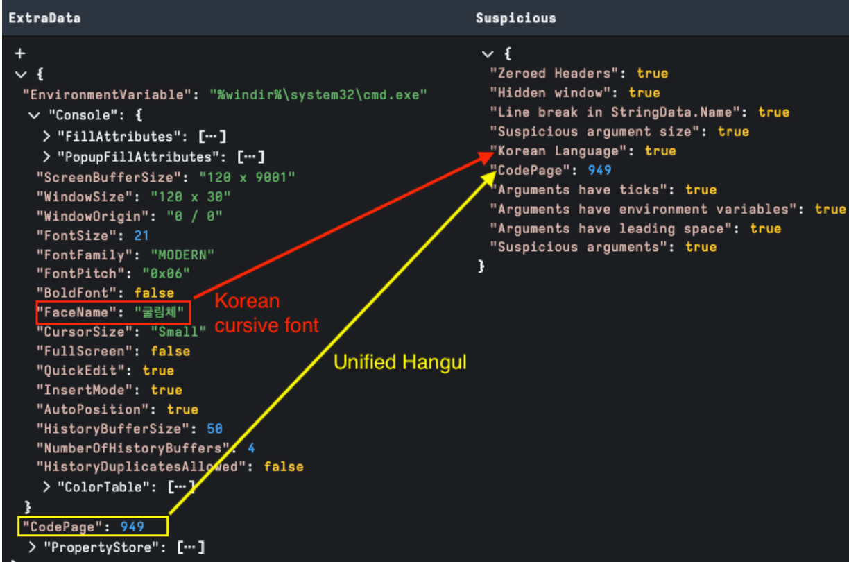 Similarly, Console datablock font information may also contain alternate language characters. CodePage reference can also highlight alternative character encoding; in figure 13 below, we can see Korean Unified Hangul CodePage 949.