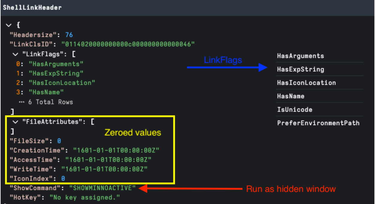 One of the anomalies we review for malicious intent is Zeroed Headers. This may indicate that the LNK file has been stripped of metadata after creation or was created using a builder tool, bypassing normal metadata generation.
