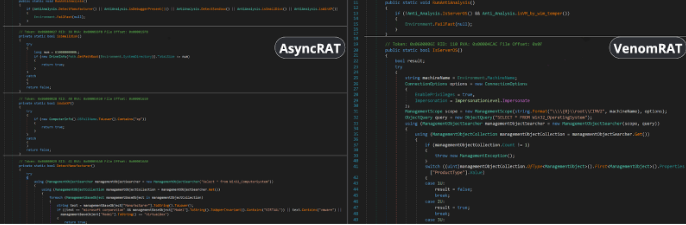 Interestingly, as these RATs evolved, some security vendors have started to blur the line between them, often grouping detections under a single label, such as AsyncRAT or AsyncRAT/VenomRAT. This indicates how closely related the two are, but also suggests that their similarities may cause challenges for detection systems. We took a closer look at recent samples of each RAT to examine how they differ, if at all.