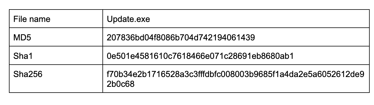 Given our high confidence that the malicious files were dropped by a .msi package (T1218.007), which in our case creates a 'WindowsNT' folder under the 'C:\Program Files (x86)' directory, we also assume that the same .msi package is responsible for dropping all the payloads listed below and executing the 'Update.exe' binary.