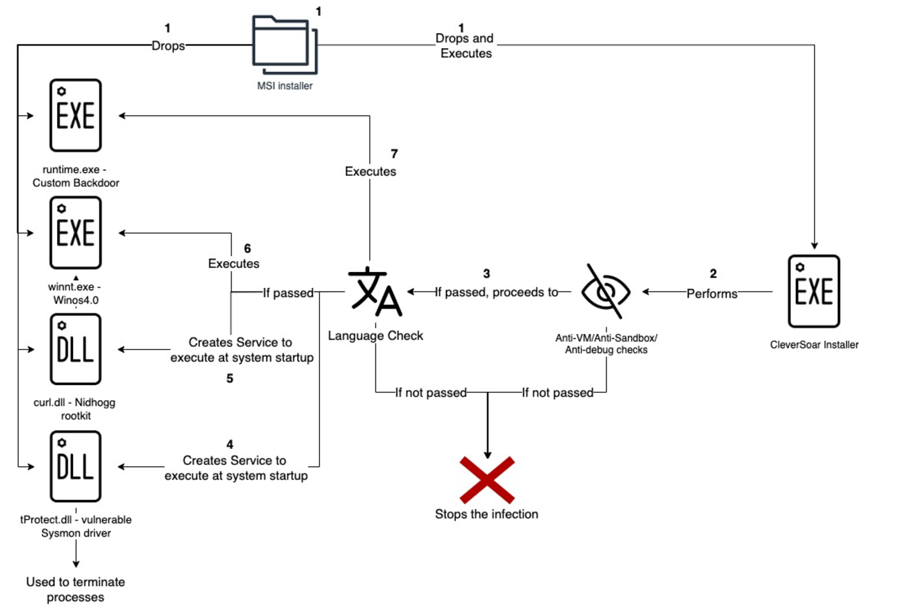 The CleverSoar campaign highlights an advanced and targeted threat, employing sophisticated evasion techniques and highly customized malware components like the Winos4.0 framework and Nidhogg rootkit. The campaign's selective targeting of Chinese and Vietnamese-speaking users, along with its layered anti-detection measures, points to a persistent espionage effort by a capable threat actor. While currently aimed at individual users, this campaign's tactics and tools demonstrate a level of sophistication that could easily extend to organizational targets. Organizations in the affected regions should take notice of the TTPs of this actor and monitor suspicious activity.