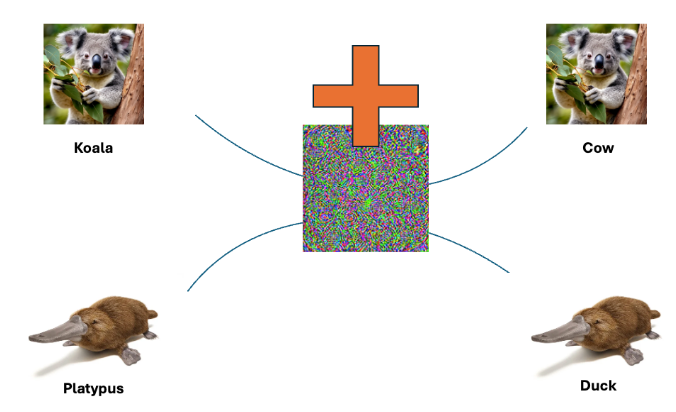 Universal Adversarial Perturbations (UAPs) are subtle modifications applied to input data (such as malware samples) to mislead AI models. What makes UAPs particularly interesting is that a single perturbation can be applied to many inputs (one ring rules them all), causing the AI model to misclassify them. Think of it as changing just a few pixels in a picture to make a powerful facial recognition system mistake someone for someone else. In the below example, a single bit of random code is added to multiple different images, resulting in the classifying model going completely wrong on the identification.