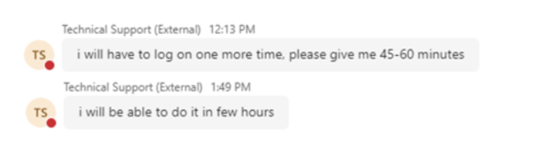 In many cases, Rapid7 has observed that the threat actor will pretend to be a member of the target organization’s help desk, support team, or otherwise present themself as IT staff. Below are examples of Microsoft Teams display names observed, by Rapid7, to be in use by operators. The display names may or may not be padded with whitespace characters. Rapid7 has also observed threat actors use a first and last name, as the chat display name and/or account username, to impersonate an IT staff member within the targeted organization.