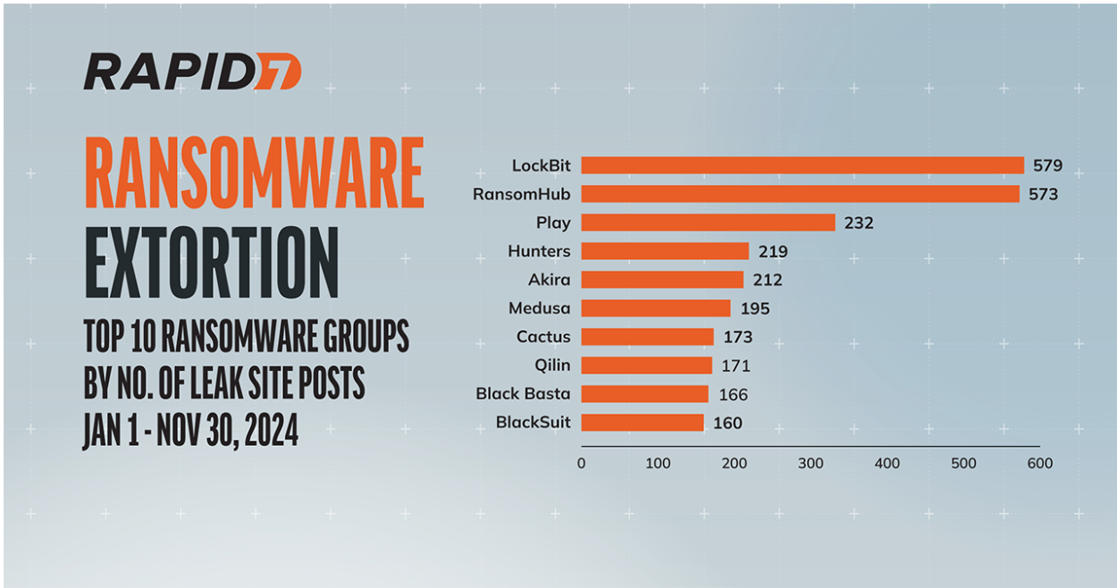 Ransomware-as-a-service (RaaS) groups like RansomHub exfiltrated data from hundreds of targets spanning healthcare, financial services, critical manufacturing, and many more. Rapid7’s ransomware data shows that since this group emerged in early February of this year, it has made 573 posts to its leak site (as of November 30). This high number of posts has earned RansomHub a spot in Rapid7’s “Top 10 Active Ransomware Groups” list for 2024, coming in a very close second to LockBit, which finished November with 579 posts. View the entire top 10 in the graphic below.