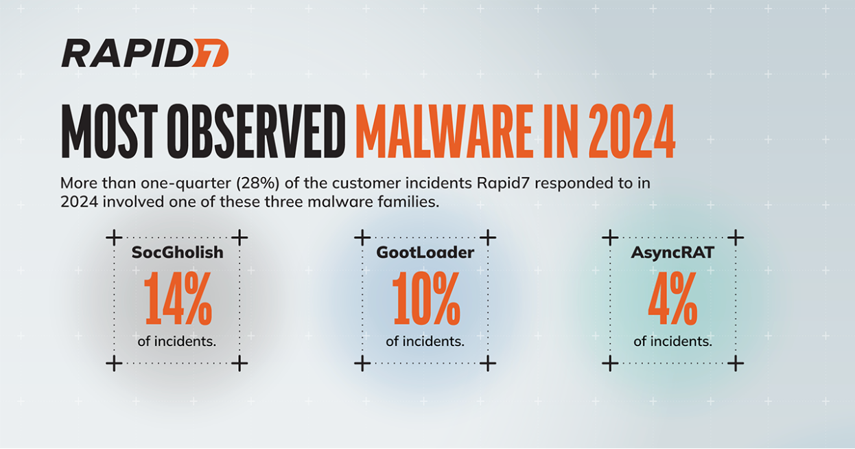 Several forms of malware have been at the front of the pack throughout 2024 across all industries. SocGholish, GootLoader, and AsyncRAT led the charge with a heady mix of remote access and credential theft. More than one-quarter (28%) of the customer incidents Rapid7 responded to in 2024 involved one of these three malware families.