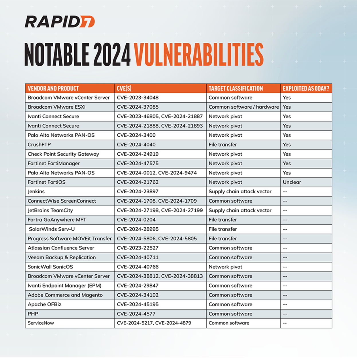 Below is a sample of notable CVEs from Rapid7’s vulnerability intelligence data, most (but not all) of which came under attack over the past 11 months.