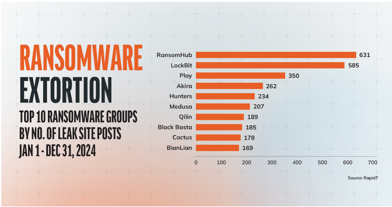Below are the 10 most prolific ransomware groups in 2024, ranked by the number of posts on leak sites:
