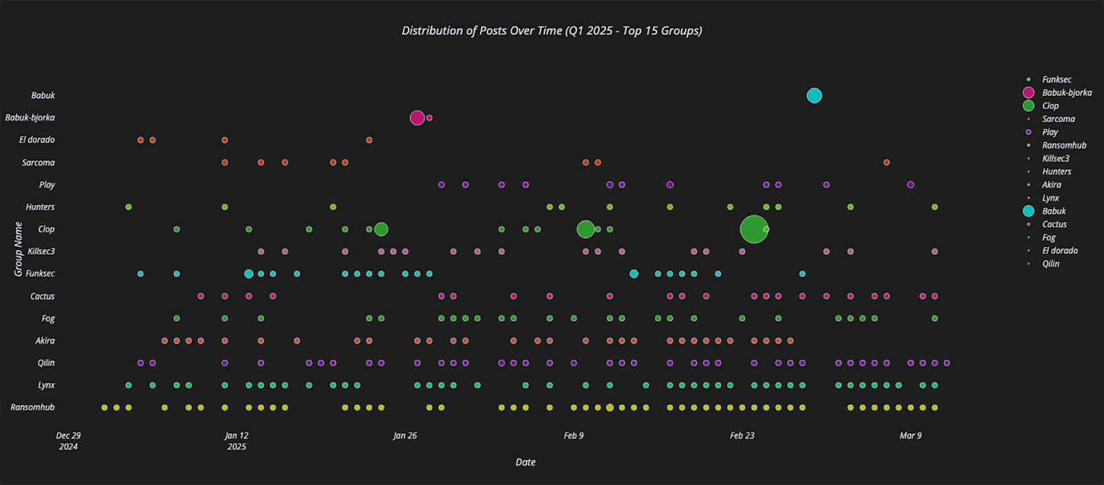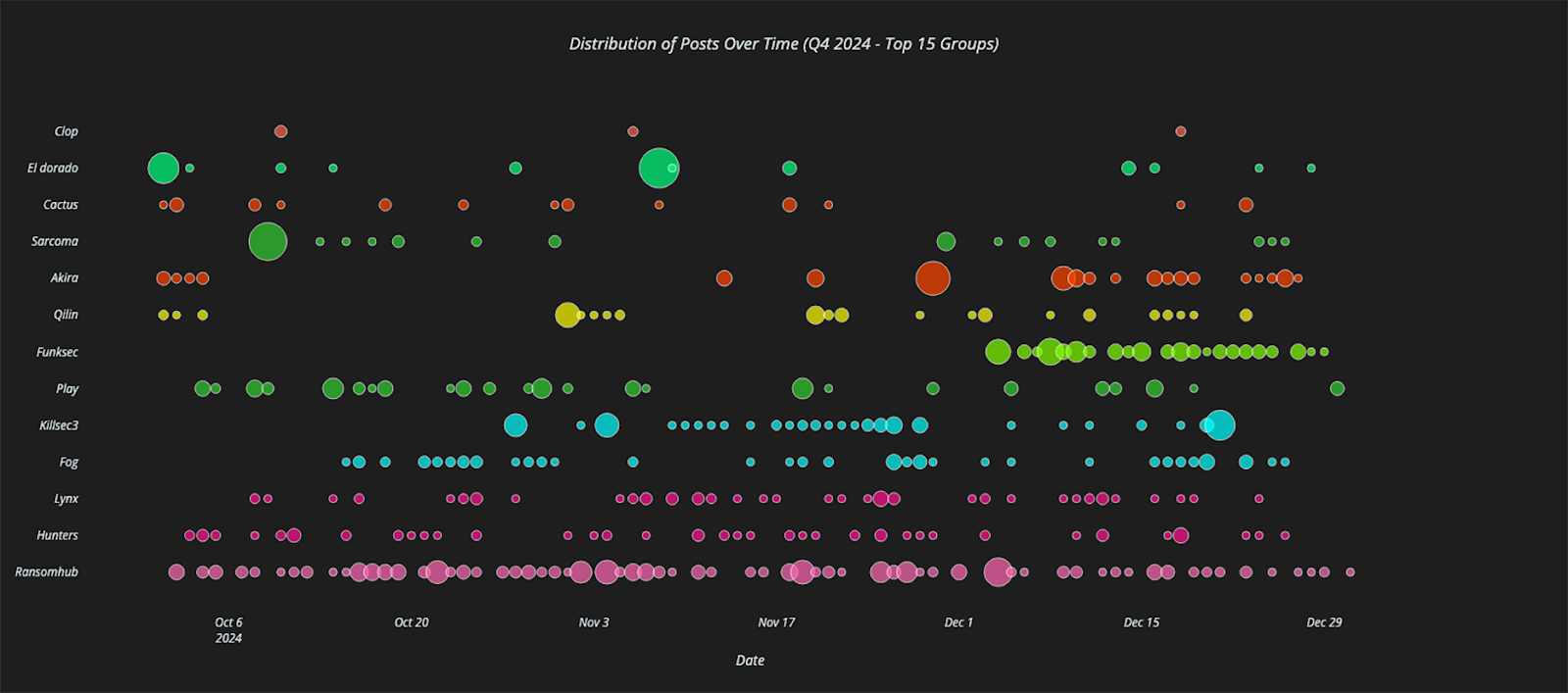 In the scatterplot below, we see Q4 2024 leak site post activity for the top 15 ransomware groups, where the dots indicate individual posts and the dot sizes indicate the amount of data being posted. Looking at Akira’s (5th from top) posting distribution, we can see that it is sporadic but its pace begins to increase around mid December. By way of comparison, RansomHub’s (bottom line) posting distribution is consistent and strong throughout the quarter.
